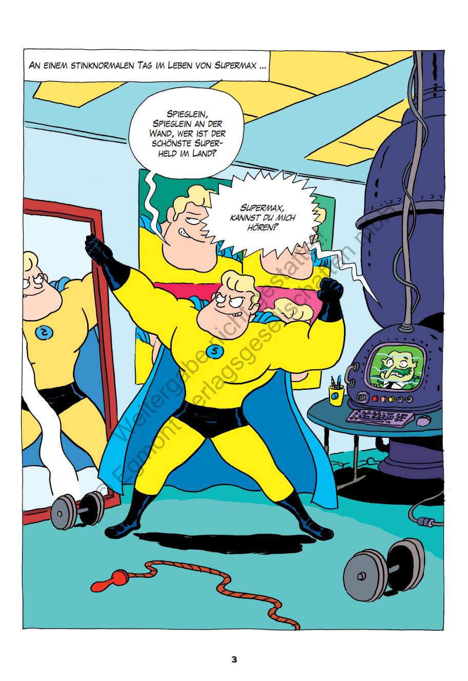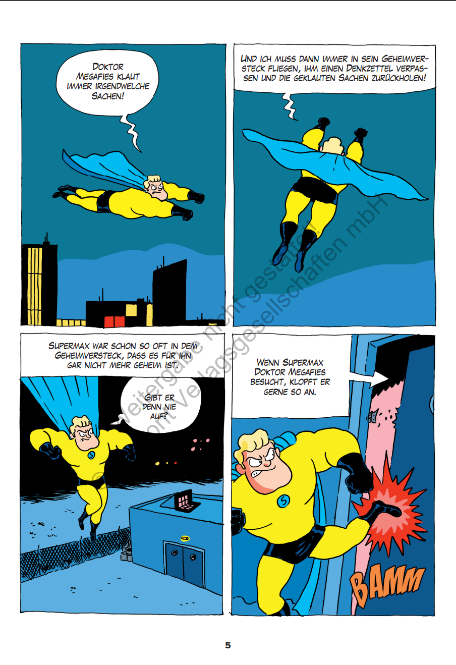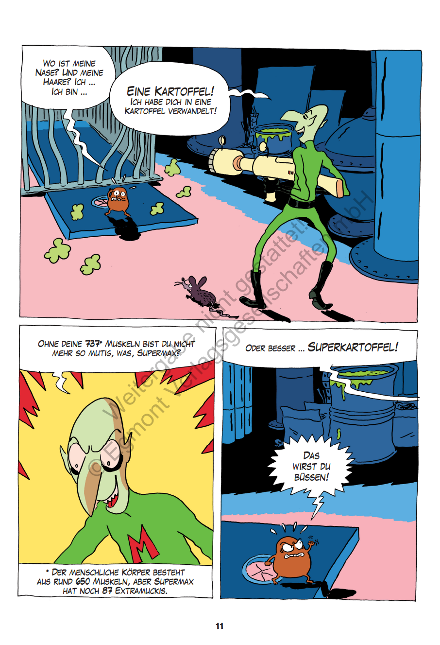 Supermax ist der tollste Superheld der Welt! Er ist stark, kann fliegen und sieht wahnsinnig gut aus. Doch sein Erzfeind, der böse Doktor Megafies, verwandelt ihn mit seiner neuen Waffe in eine Kartoffel. Aber mit einer Sache hat er nicht gerechnet: Auch als Knolle ist Supermax noch übermenschlich stark, kann fliegen und sieht wahnsinnig gut aus (findet er zumindest). Dann muss er halt als Kartoffel das Böse bekämpfen!